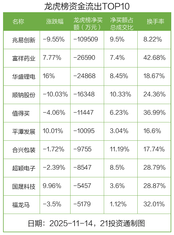 而龙虎榜中资金净流出最多的是兆易翻新(603986.SH),被净卖出为10.95亿元,占总成交金额的9.5%。兆易翻新收盘着落9.55%,换手率为8.22%。