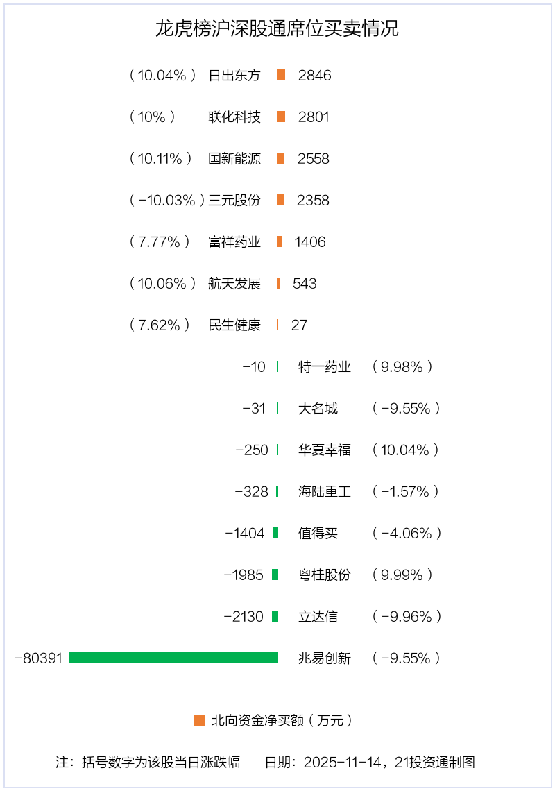 北向资金净买入7股,净卖出8股11月14日,北向资金参与龙虎榜中的个股共有15只,谈判净卖出7.4亿元。其中沪股通净买入3 股,净卖出4 股,谈判净卖出7.5亿元;深股通净买入4 股,净卖出4 股,谈判净买入1050.12万元。