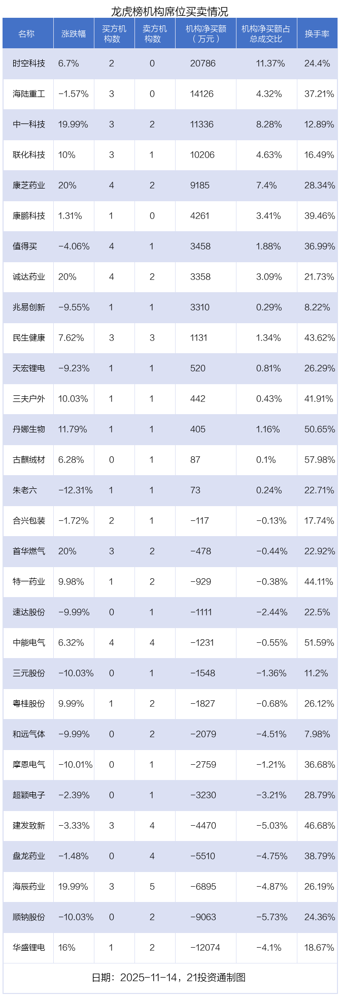 其中,机构净买入金额最多的是时空科技(605178.SH),当日收盘高涨6.7%,换手率为24.4%。