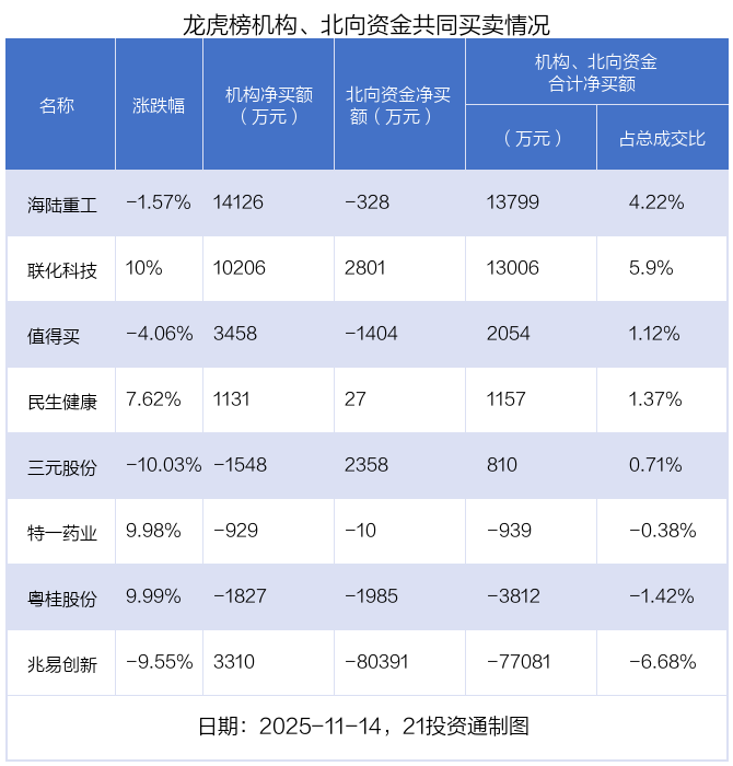 值得留意的是,机构和北向资金共同净买入了联化科技、民生健康等2股;共同净卖出了特一药业、粤桂股份等2股;在三元股份,海陆重工,值得买,兆易翻新上出现不对,机构净卖出三元股份1547.71万元,北向资金净买入2357.92万元;机构净买入海陆重工1.41亿元,北向资金净卖出327.66万元;机构净买入值得买3457.69万元,北向资金净卖出1403.95万元;机构净买入兆易翻新3310.03万元,北向资金净卖出8.04亿元。